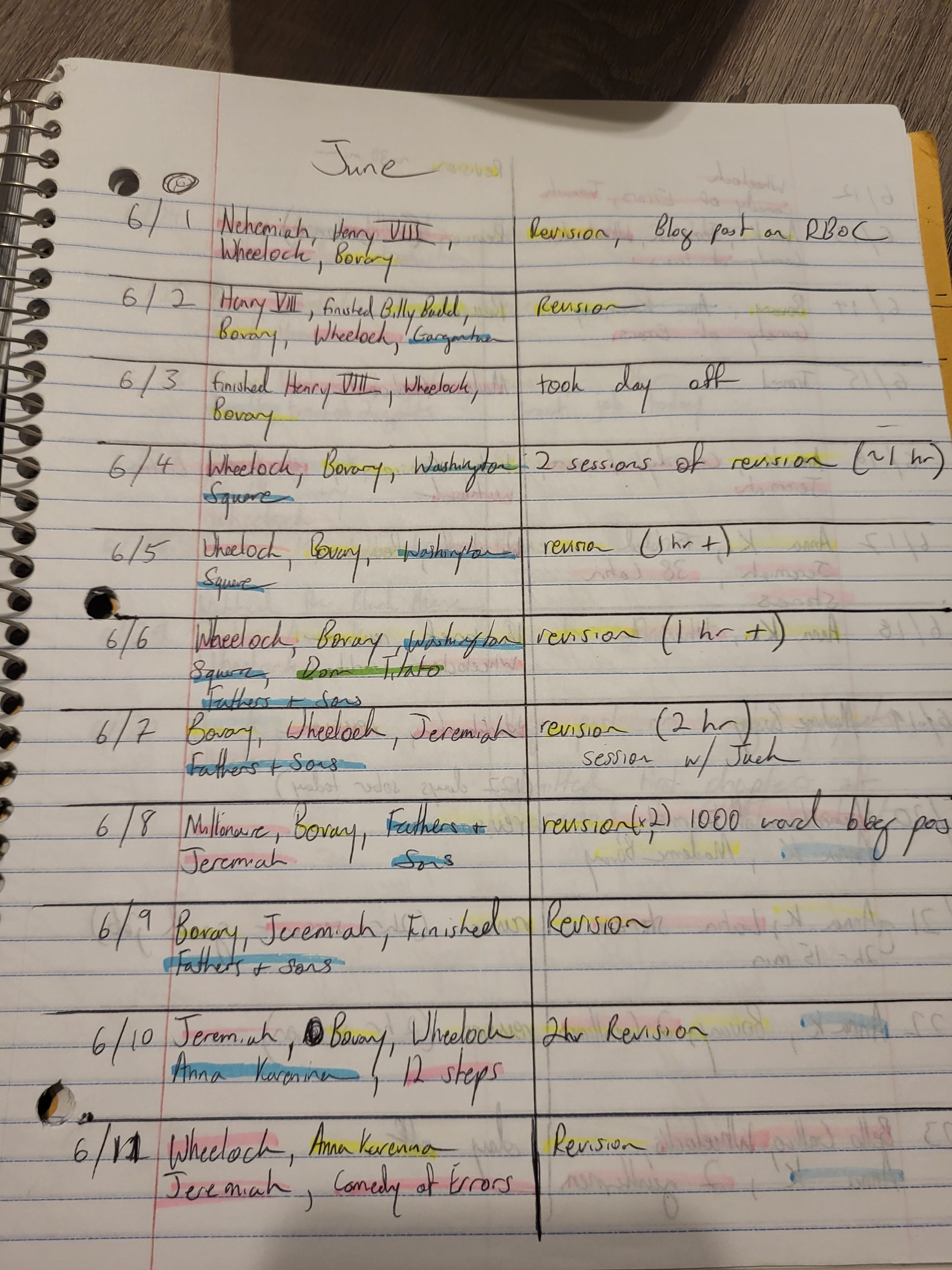 The log is what I’m most excited to share. I’ve been keeping a log of how much and how often I write for a while now, but in 2022, for the first time, I kept up the log for the entire year and now have a complete record of the work I did. Not only that, but it’s also color-coded, as you can see from the picture. The left column is the reading I did for the day, the right, the writing.